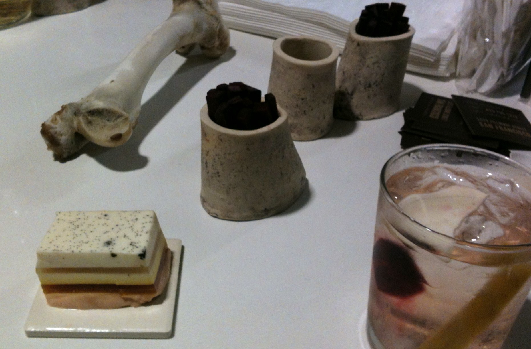 Wendy and I started on Alabama Street at the soon-to-open Salumeria for the oxtail bone marrow and rabe arancini, delicate and lovely deep-fried risotto balls with a horseradish fonduta. We worked our way up to Kadist Foundation on Folsom for Leah Rosenberg’s twist on dessert, gelatin layers of parsnips, carrots, beet and celery with a potent ginger root-beer cocktail. It was a tight squeeze into Meatpaper/Rebar on Shotwell for Danish sandwiches from Bar Tartine. As soon as Wendy and I had our nibble of pig’s ear, we headed toward Mission for David Wilson’s garage where a hot aluminum cauldron of soothing broth from 50 pounds of bones channeled the most basic form of cooking from a communal pot under a more-than-toasty fire.